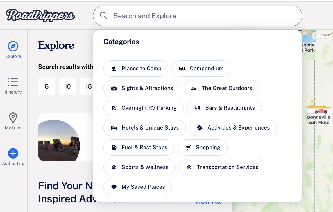 - If you want to explore another category, simply click the search bar again and select a new category, or click the X in the search bar to clear all categories from the map. Roadtrippers currently supports browsing one category at a time.